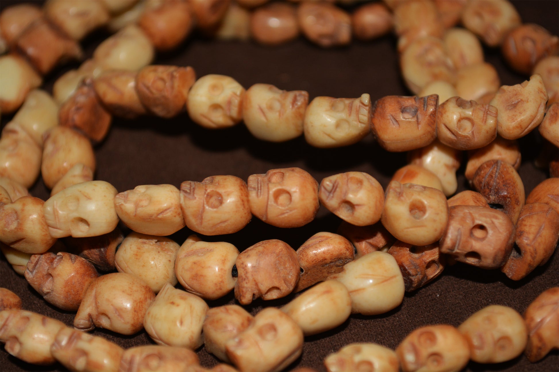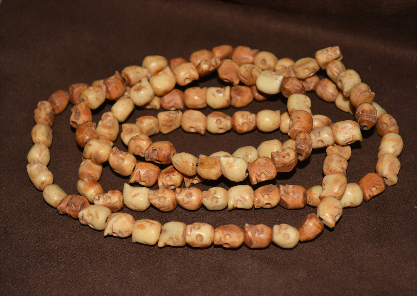 古董西藏老牦牛骨念珠108佛珠尸陀林骷髅头手串: This is a genuine tibetan old antique yak bone mala prayer beads rosary amulet, +100 years old, hand carved of skull figure (chitipati shmashana adhipati).