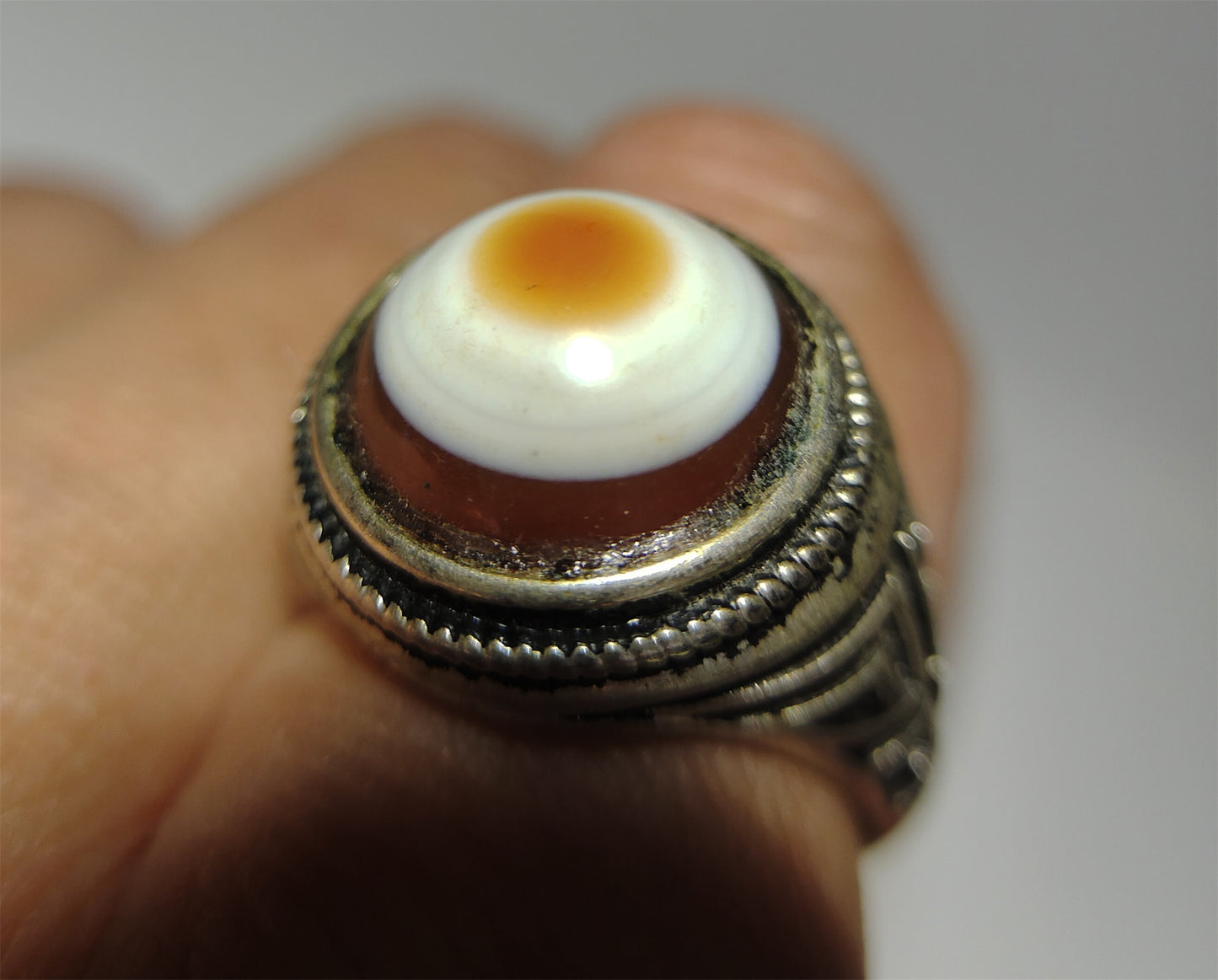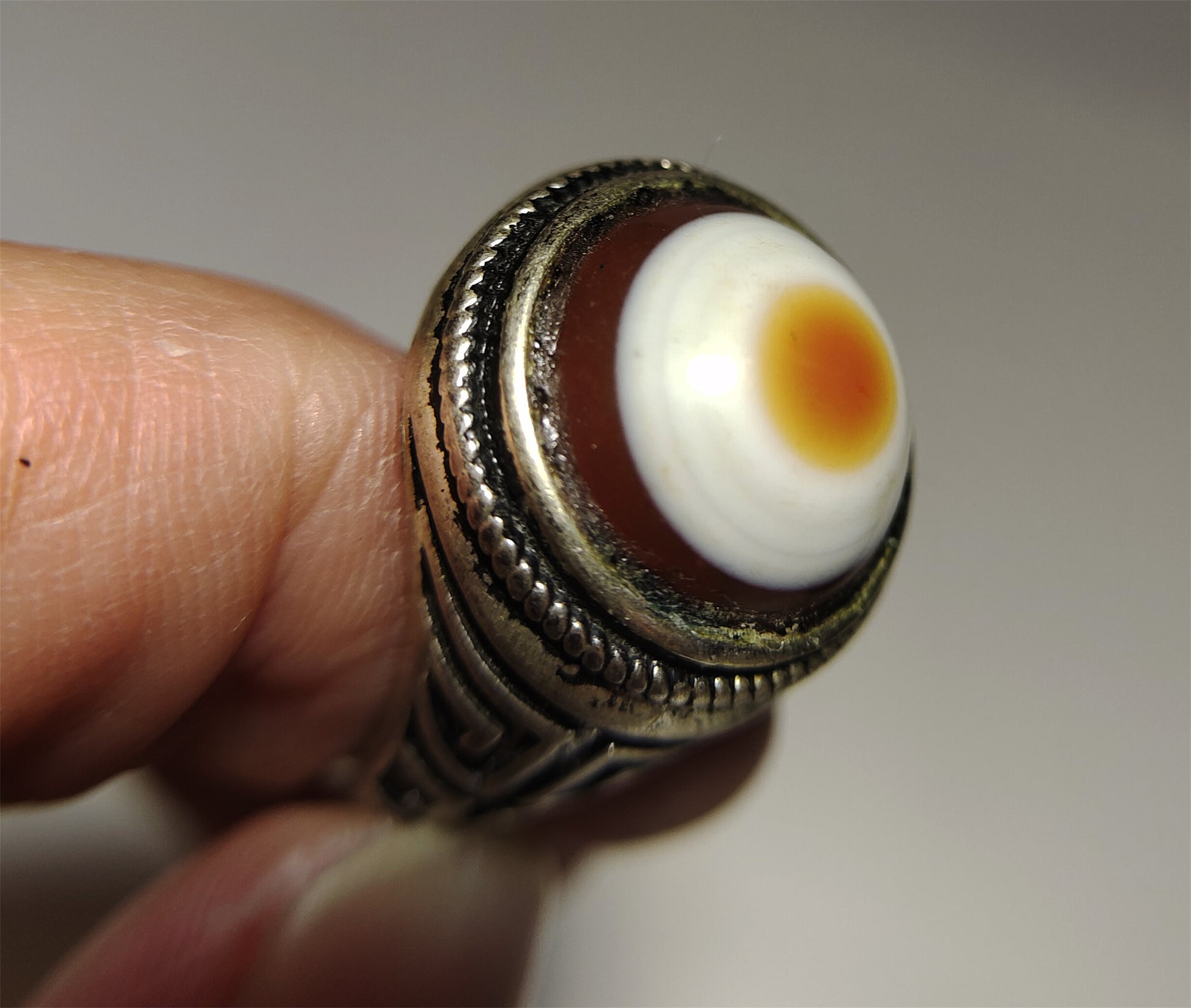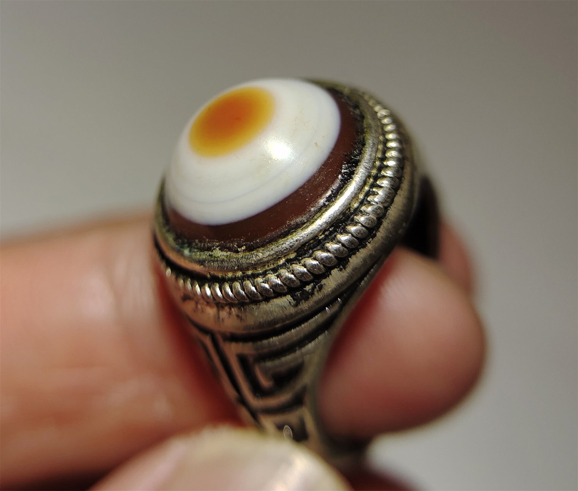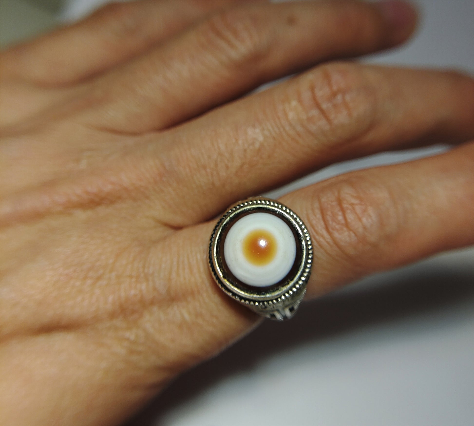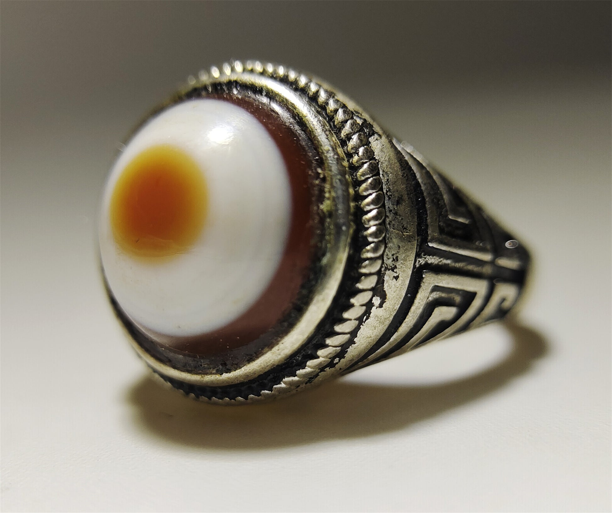 喜马拉雅千年古董马羊眼板珠天珠戒指: This is a genuine old antique himalayan agate natural pure one eye lukmik dzi bead ring amulet from tibet, please note the "eye" and the stone color are natural, Luk Mik eye also called "horse eye, goat eye or buddha's eye",100% real banded sulemani hakik agate, real himalaya dzi beads have always believed to be the most valuable and powerful energy talisman both in tibet and worldwide since ancient time, this bead measures 15mm of diameter, the metal clamp is silver, ring’s size is adjustable, in tibet culture dzi bead is believed to be the best talisman that can bless and protect its owner, only ONE piece, what you see will be what you received.