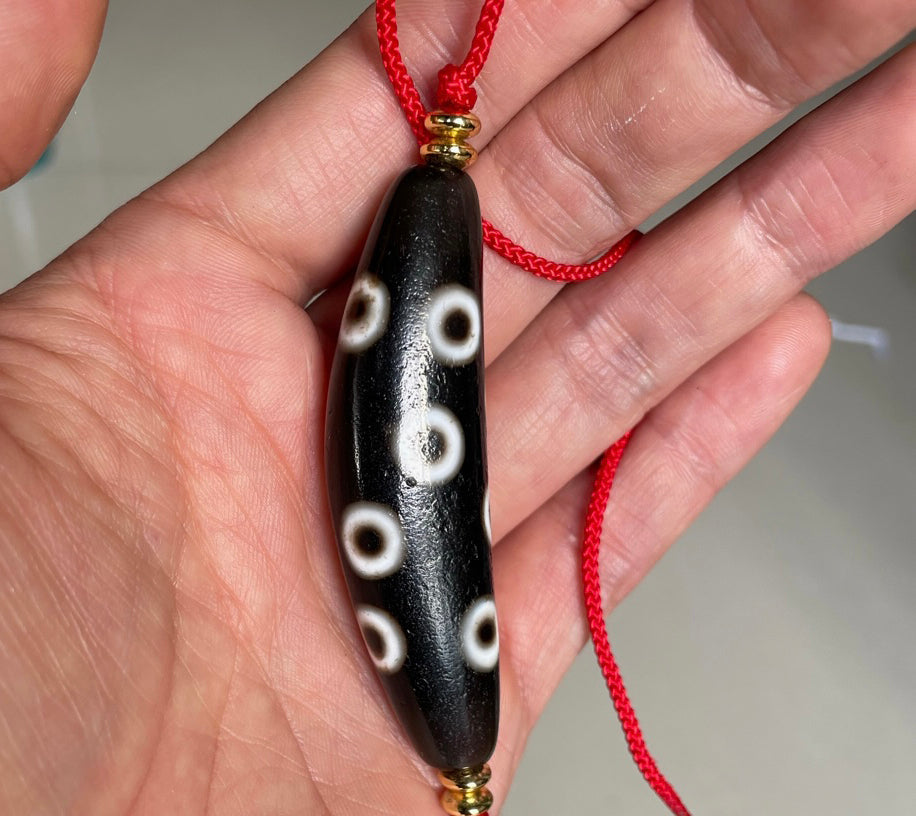 This is a genuine old Eight eyes horn shaped Dzi bead amulet from Tibet. On the back of the bead, there is another natural eye, totaling in nine eyes.